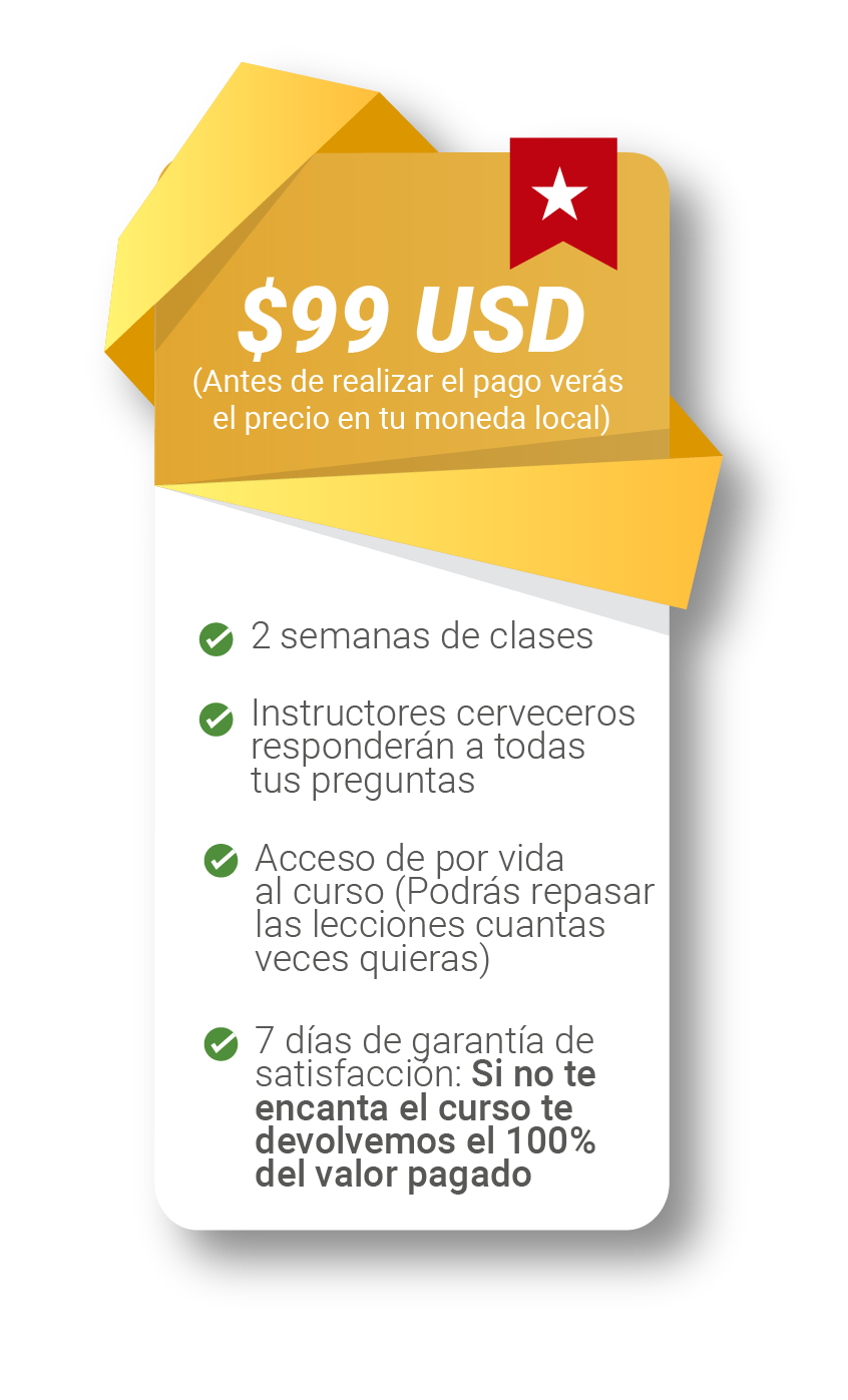 ¡Te tomará menos de 5 minutos comenzar tu aprendizaje! Solo debes realizar tu pago con cualquier tarjeta de crédito,. Paypal, PSE o inclusive pagar en efectivo*. Después de tu pago, recibirás en tu email el link de acceso para que empieces, hoy mismo, tu formación como un verdadero cervecero artesanal.